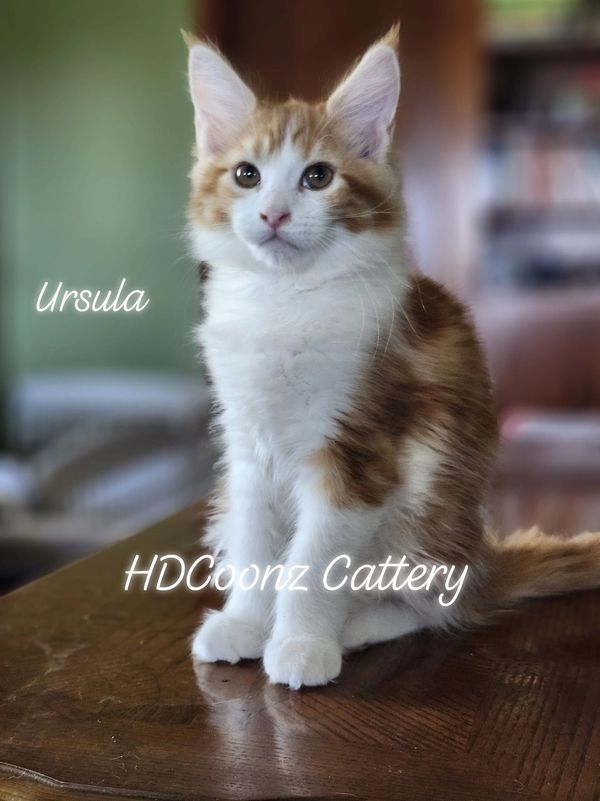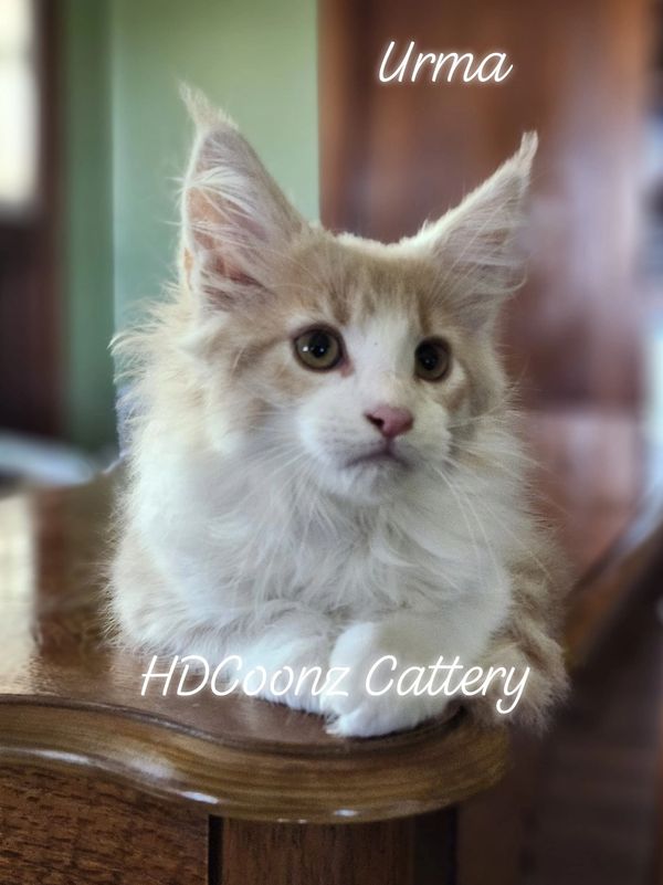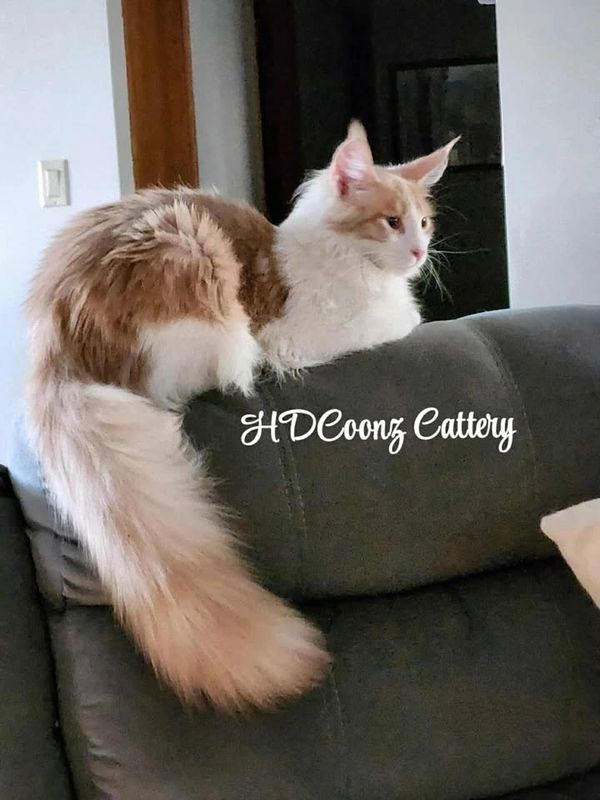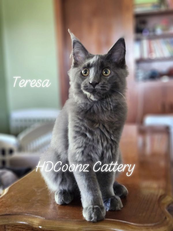 Teresa is growing through her kitten coat and her longer luxurious adult coat will start coming in around the 6 month mark so don't let the shorter coat fool you. She is a full sister to the queen I have been showing, Rhett. She is very confident, a little too confident, I would actually consider her fearless. She is not afraid to play with the dogs or be toted around by a child. She loves to climb in my lap and demand me love on her. She is a very sweet, ornery baby that loves to be flipped over and carried around like a baby.