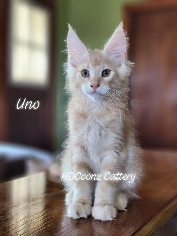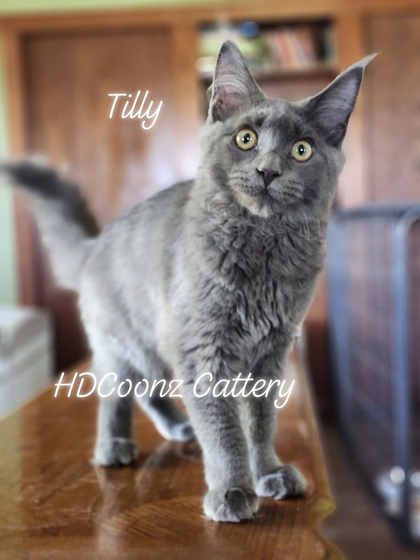 Tilly is a large girl. She is growing through her kitten coat and her longer luxurious adult coat will start coming in around the 6 month mark so don't let the shorter coat fool you. She is a full sister to the queen I have been showing, Rhett. She is very confident and not afraid to play with the dogs or be toted around by a child. She is a little more laid back than her sister but still likes to climb in my lap and let me love on her. She likes to be cuddled in my arms on her back like a baby.
